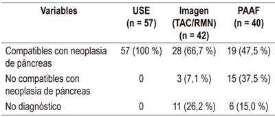 De acuerdo con los resultados de la USE, todos los pacientes (n = 57) fueron compatibles con neoplasia del páncreas, a diferencia de lo reportado en las imágenes y en la PAAF, en las cuales solo el 66,7 % y el 47,5 % fueron compatibles, respectivamente. A continuación, se presentan las conclusiones de las diferentes pruebas diagnósticas, categorizadas como compatibles con neoplasia del páncreas, no compatibles con neoplasia o resultado no conclusivo (Tabla 4).