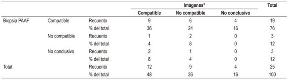 Entre tanto, la Tabla 5 muestra la evaluación de concordancia entre los resultados de las imágenes radiológicas y de la biopsia PAAF-USE, sobre 25 pacientes en los que se tuvieron disponibles los resultados de las dos pruebas diagnósticas. El coeficiente kappa fue de 0,02 (intervalo de confianza [IC], 95 %: −0.04-0,08); 14 casos tuvieron resultados discordantes.
