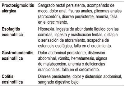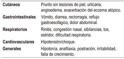 Se presentan varias horas o días después de la ingesta del alérgeno (Tabla 3). Estos síntomas comprometen predominantemente el tracto gastrointestinal, pero casi siempre son múltiples 2,14,19,28,29.
