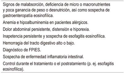 La realización de pruebas endoscópicas en un paciente con diagnóstico de APLV no es una práctica común en este grupo de enfermedades, dado que el diagnóstico es clínico. Por tanto, la decisión de efectuar estas pruebas se basa en criterios clínicos bien definidos, según las características del paciente, su estado nutricional, pruebas de laboratorio y las manifestaciones clínicas evidentes. Las indicaciones de endoscopia digestiva se pueden observar en la Tabla 435,36.