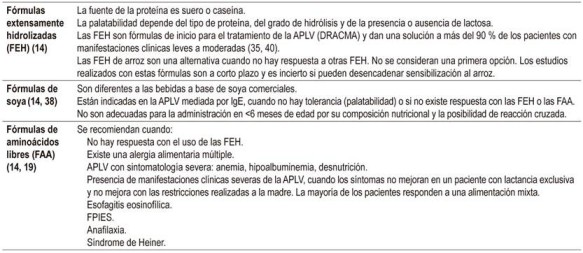 A continuación, se describen algunos factores que deben considerarse a la hora de elegir una fórmula para el manejo nutricional de los pacientes con APLV 37,39 (Tabla 6).