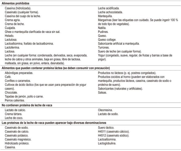 En pacientes con APLV, se requiere la estricta eliminación de la PLV de la dieta de la madre y del lactante. Se indica a la madre una dieta de eliminación de toda fuente de proteína láctea y se deben dar suplementos de calcio. Asimismo, se requiere informar a los padres y los cuidadores sobre las vías de sensibilización del niño y la revisión cuidadosa de las etiquetas de los productos que puedan tener componentes de proteína láctea (p. ej. cosméticos, jabones, cremas, lociones, pañitos húmedos, salsas, entre otros) (Tabla 8).