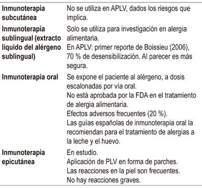 En la última década, se ha investigado sobre otras terapias alternativas para el manejo de la APLV. Entre estas opciones se incluyen la inmunoterapia alérgeno específica, la terapia biológica, la medicina china y el uso de probióticos o prebióticos.