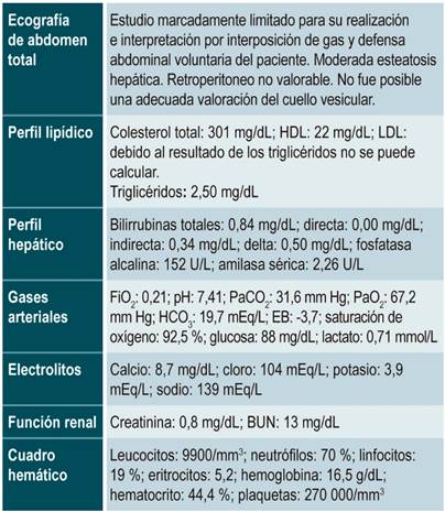 A su ingreso, el paciente manifiesta la persistencia del dolor abdominal, que alcanza una intensidad de 7/10. Además, presenta deshidratación, así como una frecuencia cardíaca (FC) de 89 lpm, una frecuencia respiratoria (FR) de 20 rpm, una saturación de oxígeno de 90 % al ambiente, una tensión arterial (TA) de 120/64 mm Hg y una temperatura 36,4 ºC (Tabla 1).