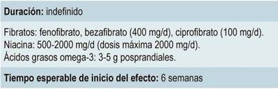 Entre tanto, los ácidos omega-3 (ácido docosahexaenoico [Docosahexaenoic Acid, DHA] y ácido eicosapentaenoico [Eicosapentaenoic Acid, EPA]) disminuyen, de forma proporcional a su dosis, los niveles de triglicéridos 30. Es así que 3-5 g de EPA asociados a DHA reducen el 20-50 % de este tipo de grasas. Además, aumentan de manera concomitante el HDL en cerca del 5 %. Por lo tanto, se infiere la pertinencia de la prescripción ambulatoria de estos ácidos en caso de que los fibratos se encuentren contraindicados) 30,31,32(Tabla 5).