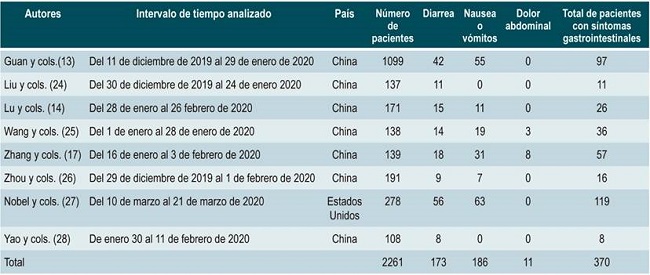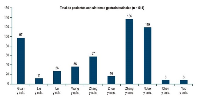 Un estudio retrospectivo de Luo y colaboradores, que incluyó a 1141 pacientes desde el 1 de enero de 2020 hasta el 20 de febrero del mismo año, encontró que el 16 % (n = 183) de estos pacientes tenían síntomas gastrointestinales: pérdida de apetito (n = 180) como síntoma principal, seguido de náuseas (n = 134), vómitos (n = 119) y diarrea (n = 68) 9.