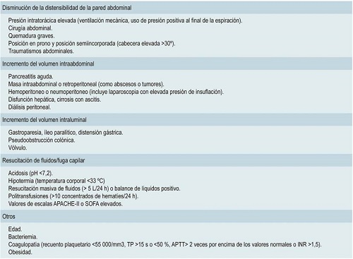 Con ese panorama, existen múltiples factores para el desarrollo del SCA. Estos se pueden clasificar según se produzca una disminución de la distensibilidad de la pared abdominal o del diafragma, así como un incremento del volumen intraabdominal o ambas (Tabla 1).