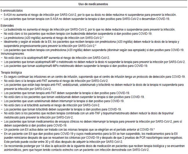 Los síntomas gastrointestinales son comunes en pacientes con COVID-19 y tuvieron una mayor prevalencia en la etapa posterior de la epidemia reciente en China. El SARS-CoV-2 ingresa a las células epiteliales gastrointestinales, por lo que las heces de los pacientes con COVID-19 son potencialmente infecciosas. Se necesita una mayor evidencia para tener guías de tratamiento en los pacientes con EII; sin embargo, hasta el momento, el consenso es no suspender el tratamiento inmunosupresor si no hay confirmación de infección.