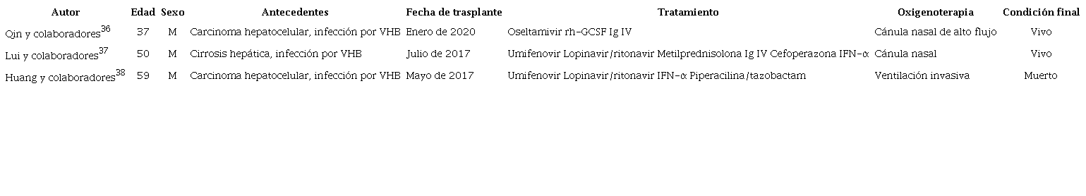 Adicionalmente, en pacientes con antecedente de trasplante hepático e infección por SARS-CoV-2 existe el riesgo de transmisión de donantes a receptores; además, cuando el receptor desarrolla la enfermedad puede generar mayor carga viral y diseminación, ocasionando mayor potencial de contagio a otros individuos33. Hasta el momento, existen varios reportes de caso que evidencian el curso clínico y desenlaces de pacientes con antecedente de trasplante hepático y COVID-19 (Tabla 1). Cabe mencionar que, en todos los casos, el diagnóstico se realizó mediante PCR-RT y el manejo inmunosupresor fue disminuido durante el curso de la enfermedad. Asimismo, una serie de casos de Italia presentó 3 pacientes que fallecieron por infección por SARS-CoV-2, aunque se habían realizado el trasplante hace más de 10 años. Estos pacientes tenían en común edad > 65 años, hipertensión, sobrepeso, diabetes mellitus y dislipidemia. Por ende, este desenlace parece relacionarse más con la presencia de estas comorbilidades, en lugar de una complicación directa del trasplante34. En este tipo de pacientes, las estrategias se dirigen básicamente a la prevención, utilizando medidas como el aislamiento social, evitar los viajes innecesarios, realizar consultas médicas mediante telemedicina, higiene de manos, chequeo constante de temperatura y asistir tempranamente a un centro de salud en caso de presentar sintomatología asociada con infección por SARS-Cov-235.