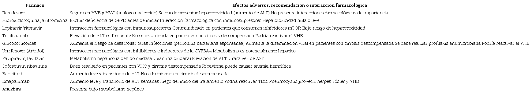 Para aquellos pacientes que desarrollan enfermedad hepática por SARS-CoV-2, el manejo no está bien definido y se fundamenta en guías estándares1,16. Sobre el tratamiento se ha estudiado la administración de varios medicamentos (remdesivir, lopinavir, ritonavir, hidroxicloroquina, azitromicina, umifenovir, entre otros). No obstante, en pacientes con enfermedad hepática preexistente o aquellos que la desarrollan durante la infección, debe evaluarse el riesgo de hepatotoxicidad, las interacciones farmacológicas y recomendaciones de uso (Tabla 2) para evitar agravar el cuadro clínico1,39.