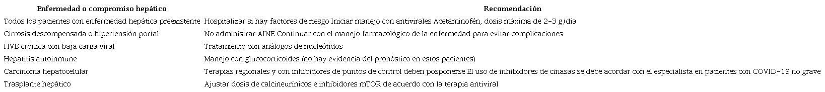 Para pacientes con enfermedad hepática preexistente que se infecta con SARS-CoV-2 hay mayor evidencia del manejo dependiendo de la entidad que presenten (Tabla 3), en general se recomienda la hospitalización si presentan factores de riesgo que puedan suponer un evento grave (hipertensión, diabetes, obesidad, cirrosis, carcinoma hepatocelular o trasplante hepático), la inclusión de tratamientos antivirales, seguir las guías de manejo para enfermedad hepática y prevenir sobredosis de acetaminofén con dosis de 2-3g/día39.