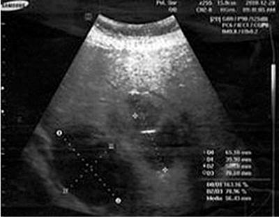 Se aprecia un hígado heterogéneo con dos imágenes mixtas; la mayor de 110 x 84 mm con áreas ecolúcidas en su interior que pudieran estar en relación con áreas de degeneración, de tamaño normal, y no rebasa reborde costal. La vesícula biliar no tiene alteraciones. El riñón derecho, que mide 100 x 40 mm, y el parénquima de 9 mm con presencia de microlitiasis en el grupo calicial medio sin dilatación del sistema. El riñón izquierdo, que mide 118 x 45 mm, y el parénquima de 15 mm sin litiasis ni dilatación del sistema. La vejiga está vacía. No hay líquido libre en la cavidad abdominal (Figura 1).