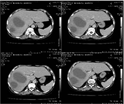 Hígado de tamaño normal con dos imágenes hipodensas en íntima relación de paredes gruesas; la mayor de 114 x 92 mm, de densidad líquida, ubicada en el lóbulo derecho inmediatamente por debajo de la cápsula de Glisson en relación con los subsegmentos VI y VII. La vesícula biliar presenta paredes finas sin litiasis, y no hay dilatación de las vías biliares. El páncreas y el bazo son de tamaño y densidad normales. Los riñones son de tamaño y posición normales, hay un buen parénquima, sin ectasia ni litiasis. La vejiga está vacía. No hay líquido libre en la cavidad abdominal. No hay adenopatías intraabdominales (Figura 2).