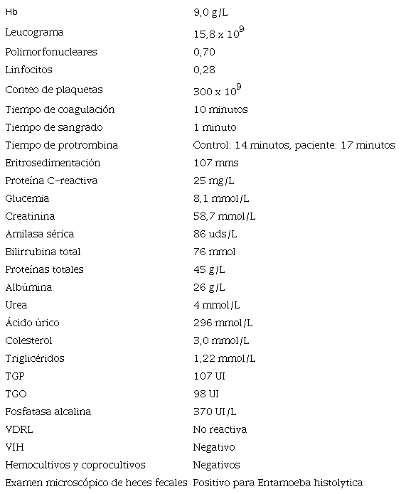Paciente femenina de 56 años de edad, de raza negra, que ingresó en el servicio de Medicina Interna por un cuadro de disentería de 14 días de evolución con compromiso severo de su estado general, fiebre de 38-39 grados y dolor en el hipocondrio derecho. Se indicaron exámenes complementarios, y se inició un tratamiento antimicrobiano con la sospecha clínica de disentería intestinal complicada.