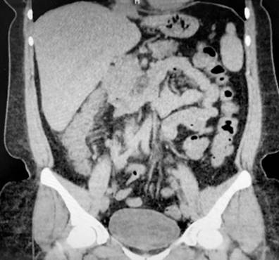 A 43-year-old female patient with a medical history of ankylosing spondylitis (AS) since the age of 20, fibromyalgia, arterial hypertension, hypothyroidism, and latent tuberculosis treated in 2019 presented to the hospital with symptoms of diffuse abdominal pain and multiple bloody diarrheal stools (more than fifteen times a day) for a week. The patient had been treated with etanercept, adalimumab, abatacept, and since 2017, with secukinumab. On admission, the patient was tachycardic, dehydrated, afebrile, and had lower abdominal pain without signs of peritoneal irritation. Laboratory tests showed no alterations in blood count, and an ultrasound and tomographic study revealed wall thickening of the right colon with mucous enhancement, multiple mesenteric lymphadenopathies, and some free fluid at the bottom of the sac (Figure 1). Colonoscopy showed edema, erythema, mucosal friability, loss of vascular pattern, and ulcerations covered by fibrin from the rectum to the cecum, which are consistent with extensive ulcerative colitis (Figure 2 ).
