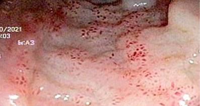 The treating clinicians decided to start the search for the gastrointestinal etiology of eosinophilia associated with gastrointestinal symptoms presented by the patient. First, he underwent an endoscopy in which moderate erythematous gastritis (histopathological examination: mild superficial chronic gastritis, without Helicobacter pylori, atrophy, or intestinal metaplasia) and nonspecific duodenitis (histopathological examination: mild chronic duodenitis with intraepithelial lymphocytes 8-10/100 epithelial cells, without typical findings of a specific disease) were found. Then, he underwent a colonoscopy that presented the following findings: in the distal ileum, from approximately 15 cm from the ileocecal valve to the distal, marked mucosa congestion was observed with “punched” erosions, punctate erythema, and loss of mucosal vascularization (Figure 1). On histopathological examination, moderate chronic ileitis was found with no specific findings. In the cecum, at the level of the ileocecal valve and proximal to the appendicular orifice, erythema of the mucosa and partial loss of mucosal vascularization were observed (Figure 2). There was a significant increase in eosinophils at the level of the lamina propria and crypts, which reached approximately > 200 eosinophils in a high-power field in the histopathological examination (Figures 3 and 4). This eosinophilic infiltrate was also accompanied by plasma cells, scarce lymphocytes, and cryptic abscesses, which are findings related to eosinophilic colitis.