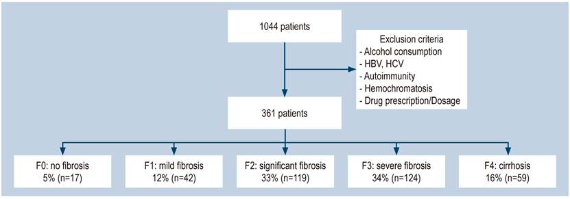 Between January 1 and December 30, 2017, a case-control study of patients diagnosed with fatty liver disease was conducted through ultrasound or other imaging methods during hepatology consultation check-ups that would have undergone real-time elastography (SuperSonic) at Centro de Enfermedades Hepáticas y Digestivas (CEHYD) in Bogotá. We considered cases of patients who showed some degree of fibrosis and performed controls on participants with fatty liver without fibrosis determined as F0. We excluded patients who reported alcohol consumption (> 10 g in women and > 20 g in men per day), positive markers for hepatitis B virus (HBV) and hepatitis C virus (HCV), autoimmunity, hemochromatosis confirmed through a genetic study, or hepatotoxic drugs intake.