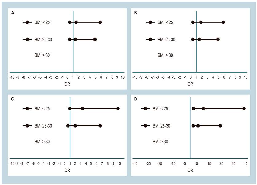 No statistically significant differences were found between the degree of fibrosis and gender (odds ratio (OR): 0.9; CI: 0.3-2.9). Unhealthy weight is associated with severe fibrosis F3 (OR: 3.24; CI: 1.03-10) and cirrhosis F4 (OR: 2.33; CI: 2.33-42.99) (Figure 2). No statistically significant differences were found between BMI impairment and any degree of fibrosis (OR: 2.74; CI: 0.90-8.40). Risk probability estimation between fibrosis and obesity was impossible because this group lacked fibrosis-free checks.