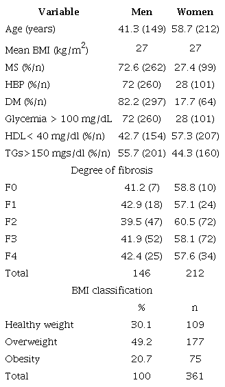 Information was taken from patients diagnosed with fatty liver disease who met inclusion criteria to establish the degree of fibrosis and its relationship with BMI.