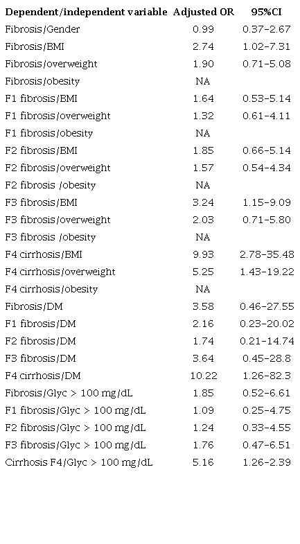 Several studies showed the association between fatty liver disease and DM27. An Italian study with 458 patients found that DM was the most important marker for fatty liver disease and a higher degree of fibrosis (OR: 1.97; 95%CI: 1.2-3.7)28. This study shows that 82.2% of men and 17.7% of women had DM. When adjusting the data for the association between severe fibrosis F3 and cirrhosis, we found an association between DM (OR: 10.22; 95 % CI: 1.36-44.6) and impaired fasting glycemia (OR: 5.16; 95 % CI: 1.23-30.33).