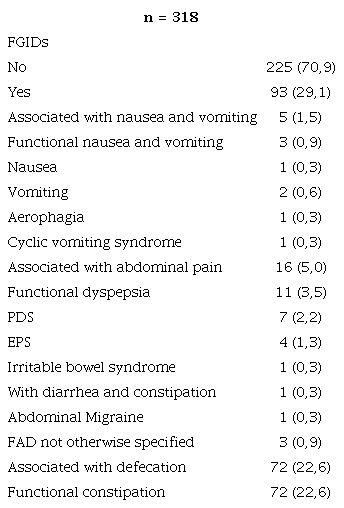 From a group of 318 adolescents who answered the QPGS-IV in Spanish, 29.1% showed some FGID. We identified FD in 3.5% (2.2% postprandial distress syndrome -PDS, and 1.3% epigastric pain syndrome -EPS) (Table 1).