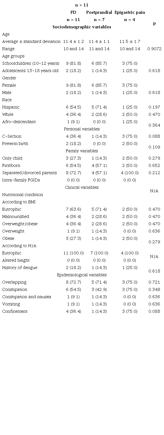 The 11 children with FD were 11.4 ± 1.2 years, 81.8% were female and 54.4% mestizo, 54.5% were firstborn, 72.7% had separated/divorced parents, and 63.6% and 100.0%, respectively, were eutrophic for BMI and height-for-age according to the World Health Organization (WHO). There was an overlap of FD in 8 of the 11 children, primarily with functional constipation in 7 children. There were no significant differences between the sociodemographic (age, gender, race); personal (cesarean section, preterm birth); family (only child, firstborn, separated/divorced parents, intrafamily FGIDs); clinical (weight, height, BMI, height-for-age, dengue history), and epidemiological (overlap, confinement) variables (Table 2).