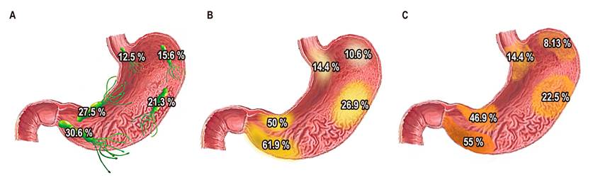 The microorganism migration theory associated with changes in gastric distribution is proposed given the hypothesis of changes in the microenvironment in the gastric mucosa affected by H. pylori, as in intestinal atrophy and metaplasia, and considering the motility characteristics of this pathogen. Additionally, current protocols do not involve taking biopsies in the gastric fundus and cardia8, which could lead to false negatives identifying H. pylori in these patients.