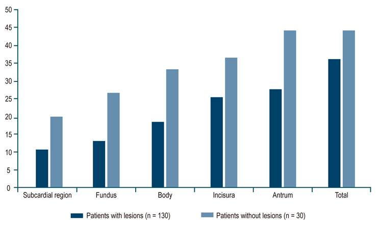 Resultados: se recolectó la información de 160 pacientes con una prevalencia de H. pylori del 37,5 %, la cual fue en aumento de proximal a distal iniciando con una prevalencia de 12,5 % en la región subcardial hasta una prevalencia de 30,6 % en el antro; hubo un patrón similar en la prevalencia de lesiones preneoplásicas. Se observó una mayor presencia de lesiones avanzadas (displasia, carcinoma) en la incisura.