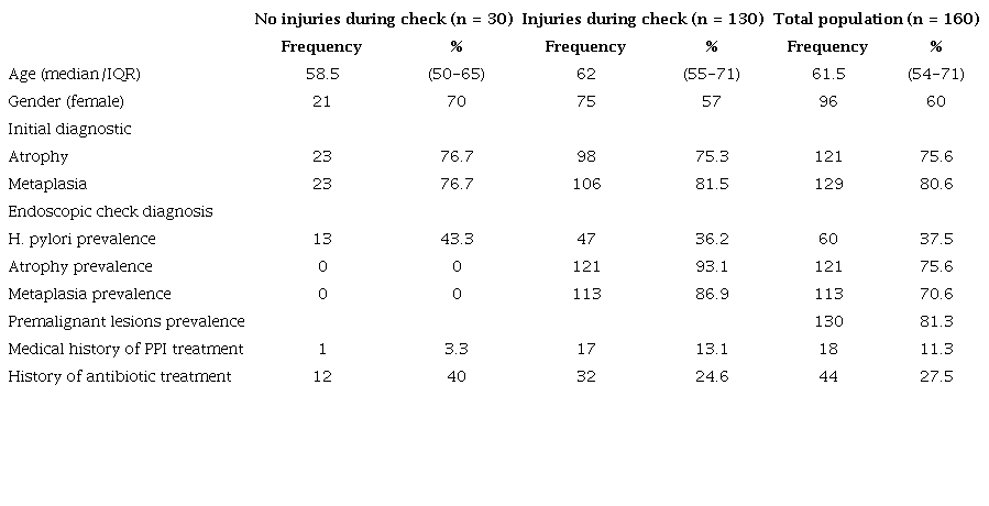 Of the potential patients in the study, 160 met the inclusion criteria, had no criteria for exclusion, and willingly agreed to participate. Most of the patients were females (60%), and the median age was 61.5 years (interquartile range [IQR]: 54-71). At the initial patients’ diagnosis, 90 (56.3%) were diagnosed with metaplasia and atrophy, 31 (19.4%) were diagnosed with atrophy, and 39 (24.3%) were exclusively diagnosed with metaplasia (Table 1).