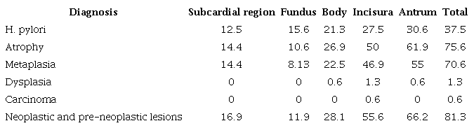 Materials and methods: a cross-sectional study in adults with a previous diagnosis of atrophy or intestinal metaplasia who entered control endoscopy and were antrum, body, incisura angularis, subcardial region, and gastric fundus biopsied. A descriptive analysis of the results by gastric regions was performed.