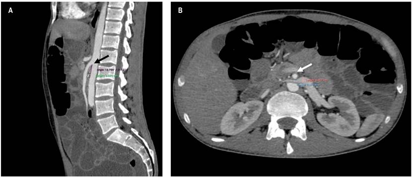 Because the clinical picture is variable, there is often a delay in diagnosis. The most typical clinical manifestations include reports of postprandial epigastric pain, nausea, vomiting, and early satiety with weight loss1-11. When SMA and Nutcracker syndrome coexists, hematuria, mainly microscopic, and proteinuria may appear when left renal vein stenosis is significant, which causes venous hypertension10-14. There are no currently validated clinical diagnostic criteria; thus, imaging studies may confirm a suspicion5-10. Conservative treatment has been proposed as the first line of action, in which nutritional support seeks to recover the mesenteric pad. Frequently, failure in therapy determines the need for surgical intervention, with high success rate reports in the literature1-13.