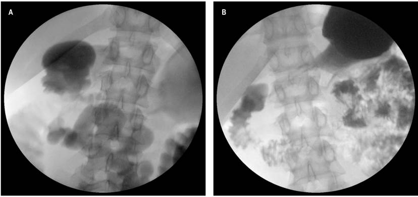 After confirming the diagnostic impression, enteral nutritional supplementation was started with poor response, persisting with nausea, vomiting, abdominal pain, bloating and early fullness, and oral tolerance. The patient underwent surgery because he did not show any improvement signs. Thus, a transmesocolic duodenojejunostomy was performed 40 cm from the ligament of Treitz. There, large retroperitoneal lymph nodes found in the procedure were sampled, which in a subsequent pathological study showed reactive lymphadenopathy and follicular and sinus hyperplasia.