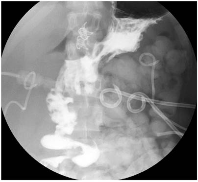 Durante el posoperatorio se realizó como seguimiento una radiografía de vías digestivas que confirmó la no continuidad pilórica con adecuada permeabilidad de la gastroyeyunoanastomosis, y una tomografía abdominal contrastada que mostró una disminución de la colección intraabdominal sin extravasaciones del medio de contraste.