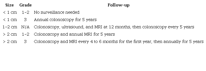 According to the European Neuroendocrine Tumor Society (ENETS), patients should be monitored after the complete resection of rectal NETs, as described in Table 2.
