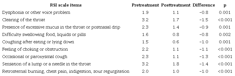 Finally, 35 patients were available for analysis. Of these, 77.1% (n = 27) were women. The mean age was 55.2 years (SD: 14.5). The mean scores of all RSI items significantly decreased statistically. On the one hand, the severity of symptoms such as throat clearing, occasional or paroxysmal cough, and the sensation of a lump or needle in the throat showed the greatest reduction after treatment. On the other hand, symptoms such as dysphonia or other voice issues, as well as difficulty swallowing, showed the least change by the end of the treatment (Table 1).