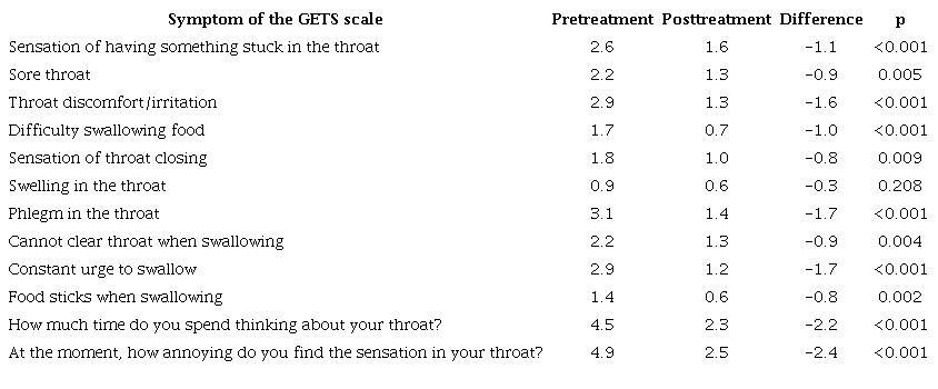 When evaluating the GETS scale, scores decreased considerably across all assessed symptoms. The difference was statistically significant for all items except for “swelling in the throat.” The symptoms that showed the greatest reduction in severity were the sensation of discomfort in the throat, the amount of time spent thinking about the throat, phlegm in the throat, and the constant urge to swallow (Table 2).