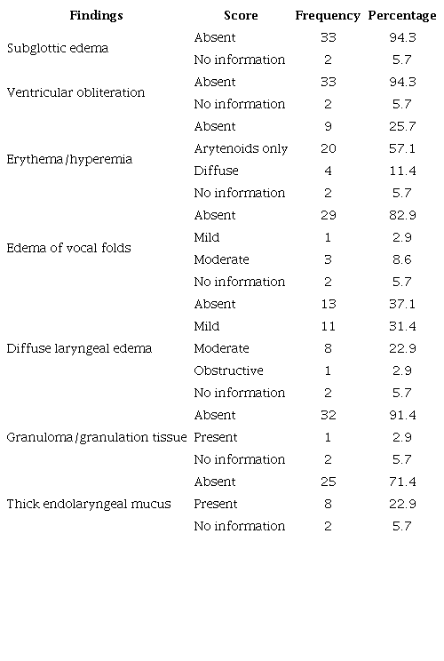 Regarding the endoscopic findings of the patients after antisecretory treatment, the most frequent observation was the presence of erythema/hyperemia in the larynx limited to the arytenoids, in 57.1% of patients. Only 8.6% (n = 3) had a positive RFS score (>7 points) for laryngopharyngeal reflux, indicating that imaging abnormalities are not necessarily required to determine the presence of the symptom. One does not exclude the other (Table 3).