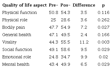 The SF-36 dimension with the highest score prior to treatment was physical functioning, with a mean of 50.8, followed by social functioning, with a score of 49.1. The lowest scores were observed in the physical role and emotional role dimensions, with scores of 25 and 24, respectively. An increase was observed in all SF-36 subscales after treatment, and in five out of the eight dimensions, the differences reached statistical significance (bodily pain, vitality, social functioning, emotional role, and mental health) (Table 4).