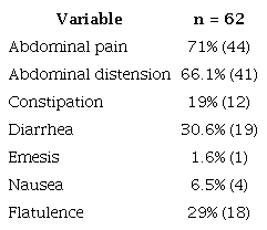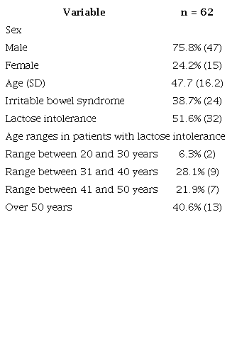 Resultados: De 397 pruebas de hidrógeno espirado realizadas entre agosto de 2020 y septiembre de 2023, se identificaron 62 PHESG; el 24,4% correspondía a mujeres, y la edad promedio fue de 47 años. Los pacientes presentaron dolor abdominal en el 71% de los casos, distensión abdominal en el 66,1%, diarrea en el 30%, flatulencias en el 29% y diagnóstico previo de síndrome de intestino irritable en el 38,7%. El 51,6% de las pruebas fueron positivas. El 44% de los pacientes con síndrome de intestino irritable presentaron intolerancia a la lactosa. No se encontró una diferencia estadísticamente significativa entre los pacientes con y sin intolerancia a la lactosa.