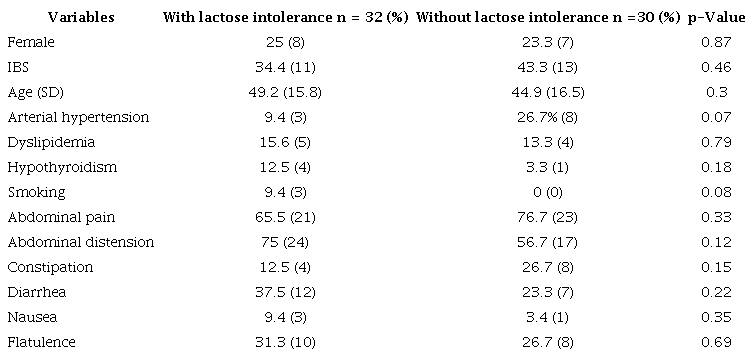 The objective of this study was to identify the factors associated with lactose intolerance in a group of patients who attended a gastroenterology diagnostic center for symptoms of bloating, abdominal pain, and diarrhea, with or without a previous diagnosis of IBS or dyspepsia.
