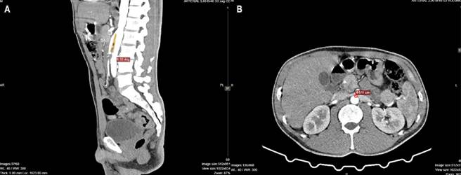In previous hospitalizations, the patient had received symptomatic pain management with partial improvement. Due to persistent abdominal pain, the Internal Medicine team ordered a contrast-enhanced computed tomography (CT) scan, which revealed dilation between the second and third portions of the duodenum. A transition zone was identified at the level of the aortomesenteric clamp, with a reduced angle of less than 8° between the superior mesenteric artery and the aorta, and an aortomesenteric space measuring only 5 mm. There was no evidence of left renal vein dilation or stenosis. These findings are consistent with a diagnosis of aortomesenteric duodenal compression syndrome (Figure 1).