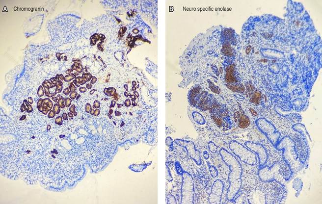 Conclusión: El presente caso clínico ilustra la importancia de realizar la colonoscopia de rutina con intubación ileal ya que puede permitir un diagnóstico temprano de los tumores neuroendocrinos del íleon distal y permitir así un tratamiento oportuno con un mejor pronóstico de los pacientes.