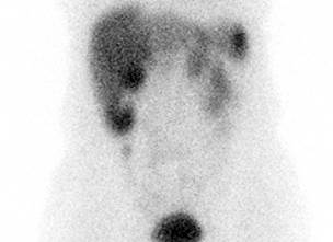 She was evaluated by oncological surgery, where an octreotide scan was ordered. This imaging showed the endoluminal lesion in the distal ileum with somatostatin receptor overexpression and an ileocolic right lymphadenopathy (Figure 4). A chest CT scan showed no evidence of metastasis. The patient underwent laparoscopic surgery, which included a right hemicolectomy with retroperitoneal lymphadenectomy.