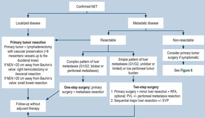 The treatment for non-metastatic SB-NETs consists of open intestinal resection with regional lymphadenectomy of at least eight lymph nodes, along with bimanual palpation of the entire small intestine to rule out synchronous lesions. In patients with unresectable metastatic disease, a conservative approach is preferred, including imaging follow-up, treatment with somatostatin analogs (octreotide), and surgical intervention in cases of intestinal obstruction4,10,11. For SB-NETs that do not respond to first-line therapy, second-line treatments such as everolimus or peptide receptor radionuclide therapy with lutetium Lu 177-dotatate (177Lu) are available10. Treatment algorithms are presented in Figures 5 and 6.
