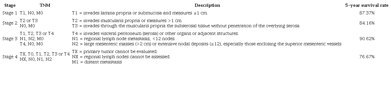 Patients in stage 3 paradoxically had better survival rates than those in stages 1 and 2. However, this lack of a hierarchical prognosis by stage may be due to insufficient lymph node dissection, which can lead to poor staging. Furthermore, survival analyses of patients with these tumors are limited because the data include cases diagnosed between 2010 and 2016, during the seventh edition of the American Joint Committee on Cancer (AJCC) staging system. With significant changes in the eighth and ninth editions, such as the inclusion of the pathological category (pN2), it is expected that this prognostic stratification will improve2.