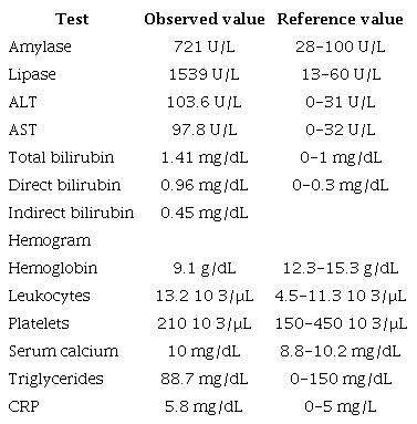 The patient presented clinical and paraclinical findings consistent with pancreatitis. After ruling out the most common causes, a consultation was requested with the gastroenterology department, where it was determined that this was a case of moderately severe pancreatitis. As further studies were carried out to determine the origin, an endoscopic ultrasound was performed, which reported acute pancreatitis without biliary duct dilatation, without lithiasis, with absence of the gallbladder, and a normal papilla.