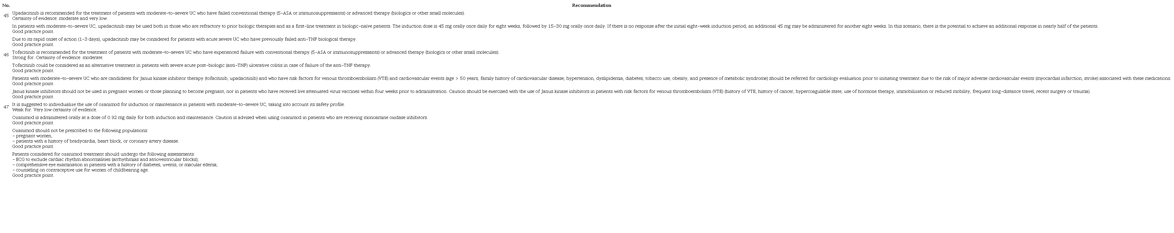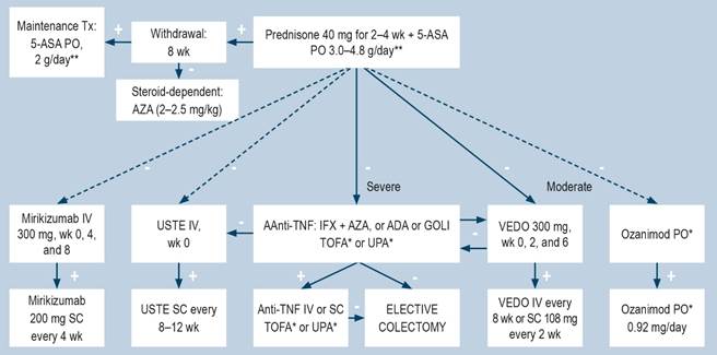 Results: Recommendations and algorithms for induction and maintenance treatment of moderate to severe ulcerative colitis were updated, and guidelines were provided on the use of new biologicals such as vedolizumab, infliximab, upadacitinib, tofacitinib, ozanimod and mirikizumab, as well as switching to vedolizumab and subcutaneous infliximab.