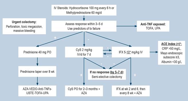 The management algorithms for outpatients with UC (Figure 1) and hospitalized patients (Figure 2) are presented next.