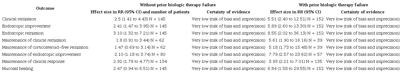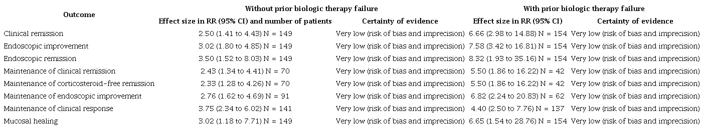 A greater effect of tofacitinib at doses of 5 or 10 mg compared to placebo was reported for failure to achieve clinical improvement (RR: 0.54; 95% CI: 0.48-0.62; one study, 593 patients, moderate certainty), failure to achieve endoscopic remission (RR: 0.88; 95% CI: 0.83-0.92; one study, 593 patients, moderate certainty), and failure to maintain mucosal healing (RR: 0.67; 95% CI: 0.61-0.74; one study, 593 patients, moderate certainty).