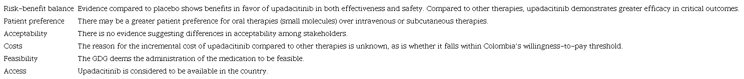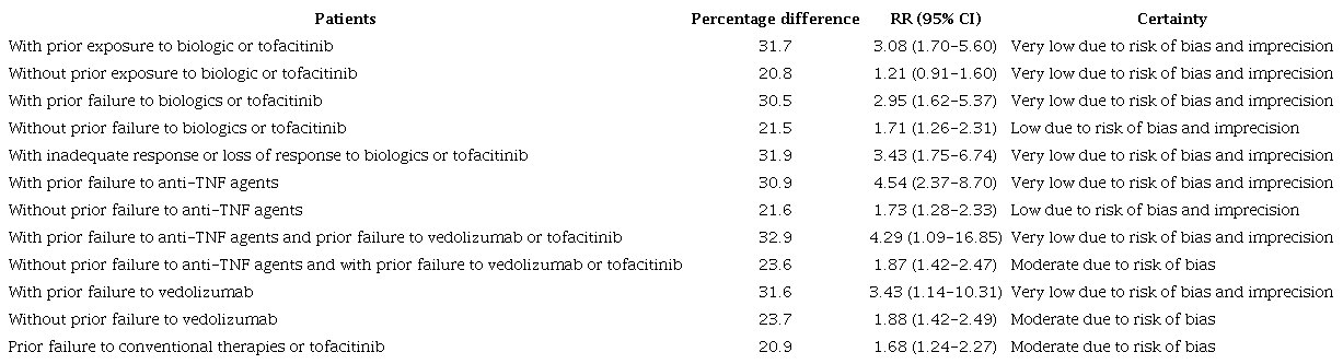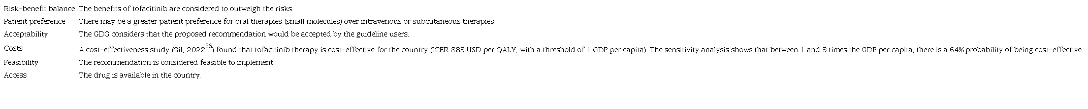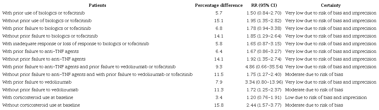 Regarding the safety of the therapies, a greater effect was found for tofacitinib at doses of 5 or 10 mg compared to placebo in treatment discontinuation due to adverse events (RR: 0.50; 95% CI: 0.33-0.77; one study, 592 patients, low certainty), and no differences were found between tofacitinib and placebo in the frequency of adverse events (RR: 1.01; 95% CI: 0.91-1.11; one study, 592 patients, moderate certainty), or in the frequency of serious adverse events (RR: 0.81; 95% CI: 0.42-1.59; one study, 592 patients, very low certainty).